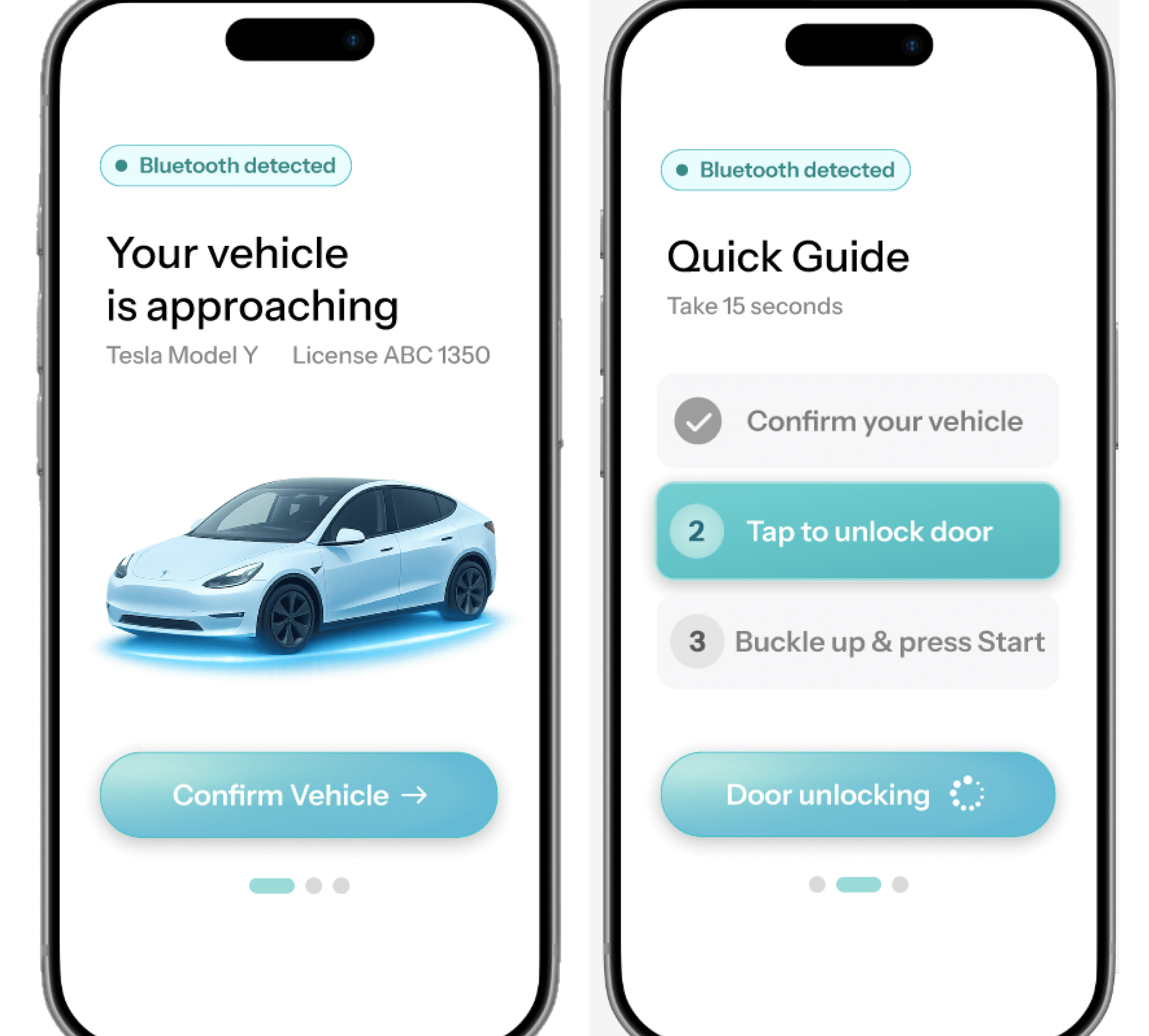 Three sequential phone screens showing the Bluetooth detection moment, the three-step guide (confirm → unlock → start), and the onboarding flow is triggered once per user. Subsequent rides skip directly to ride controls, preventing repetition.