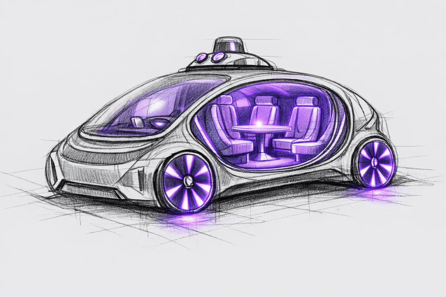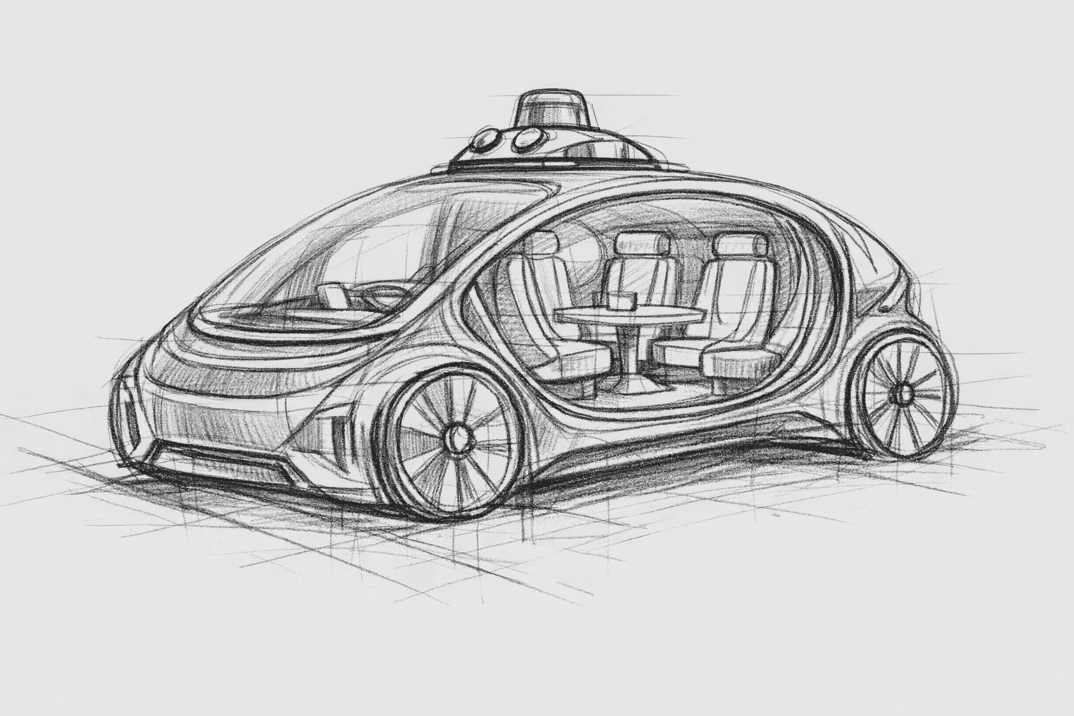 Inspiration utilizing Waymo's current LiDAR technology set up and the removal of a steering wheel. The closest reference to a current working model of a no steering robotaxi is ZOOX which has been labeled as toaster-shaped.